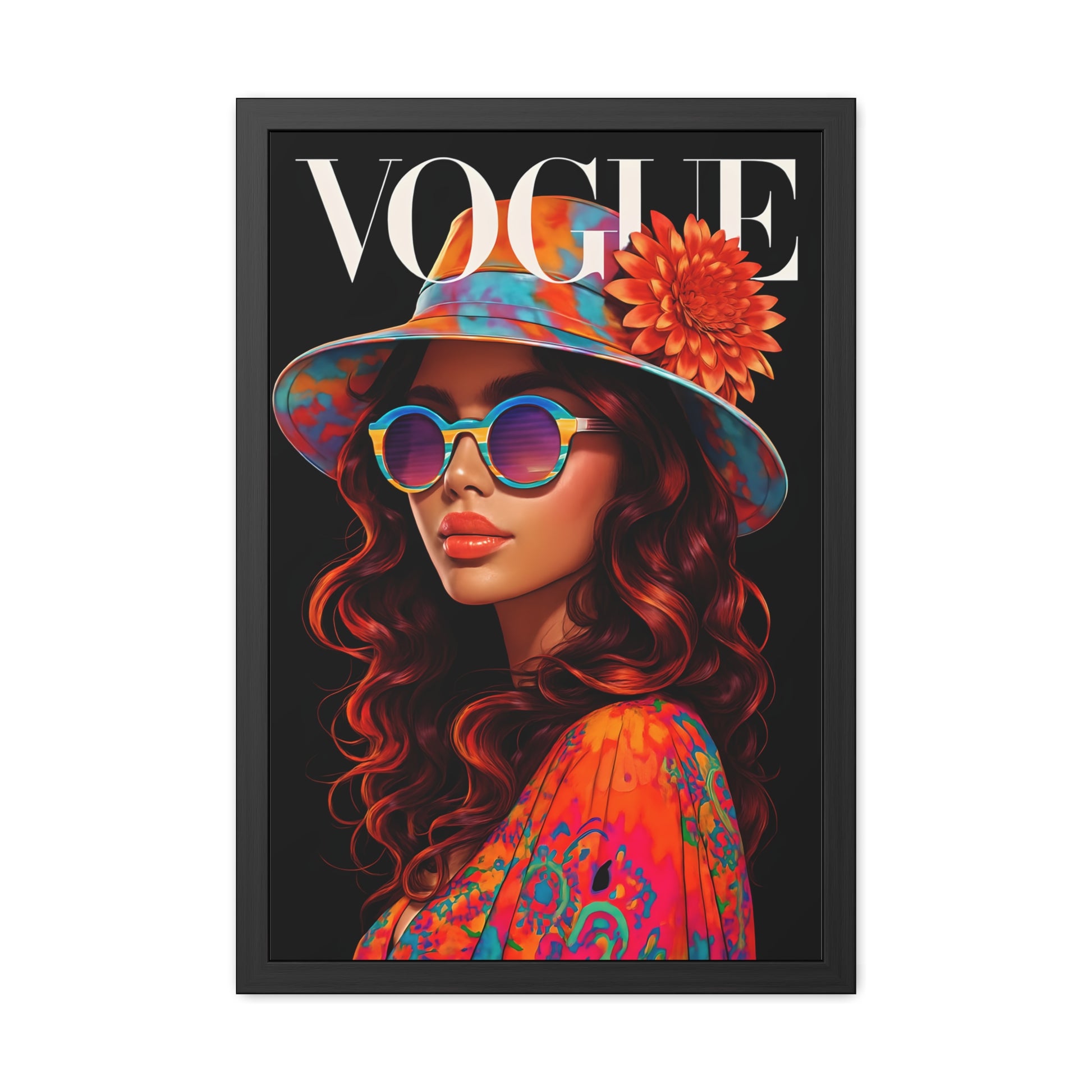 This 70s inspired vibrant vogue poster will add a pop of color and retro flair to any room. Perfect for those looking to add a touch of nostalgia to their decor, this framed poster is ready to hang and available in 18 sizes to suit any space.