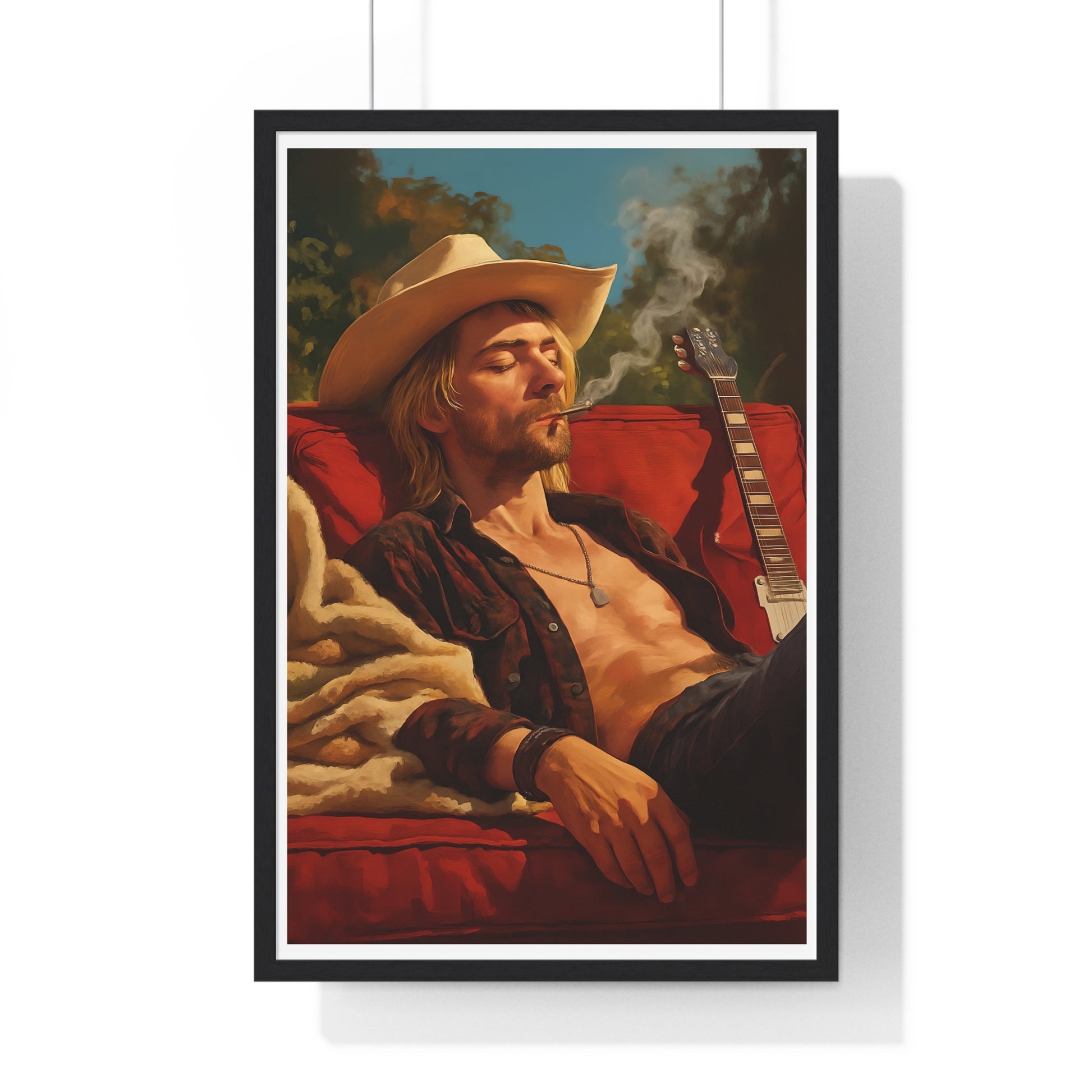 This vertical framed poster features a relaxing image of Kurt Cobain outside in the sun. Perfect for music lovers who want to bring a touch of nostalgia into their space. Ideal for decorating bedrooms, living rooms, or home offices. Great for fans of Nirvana and 90s grunge. Suitable for birthdays, Father's Day, or as a dorm room decor.