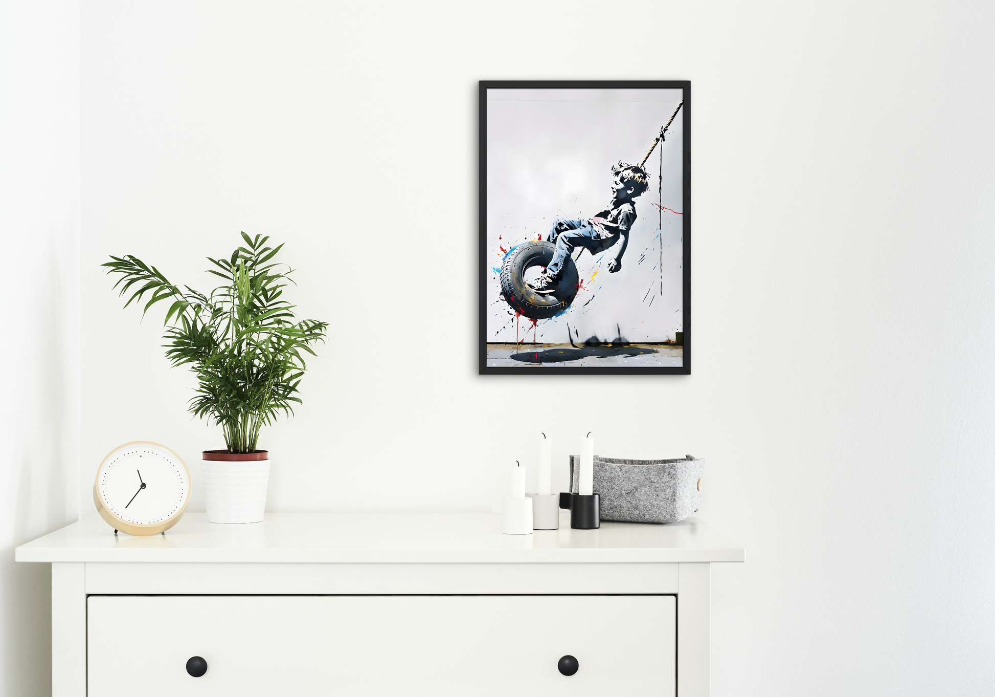 Bring joy and creativity to your space with our Urban Art Print featuring a happy boy playing on a tire swing. This vibrant piece embodies the spirit of childhood and adventure, making it a perfect addition to any room.