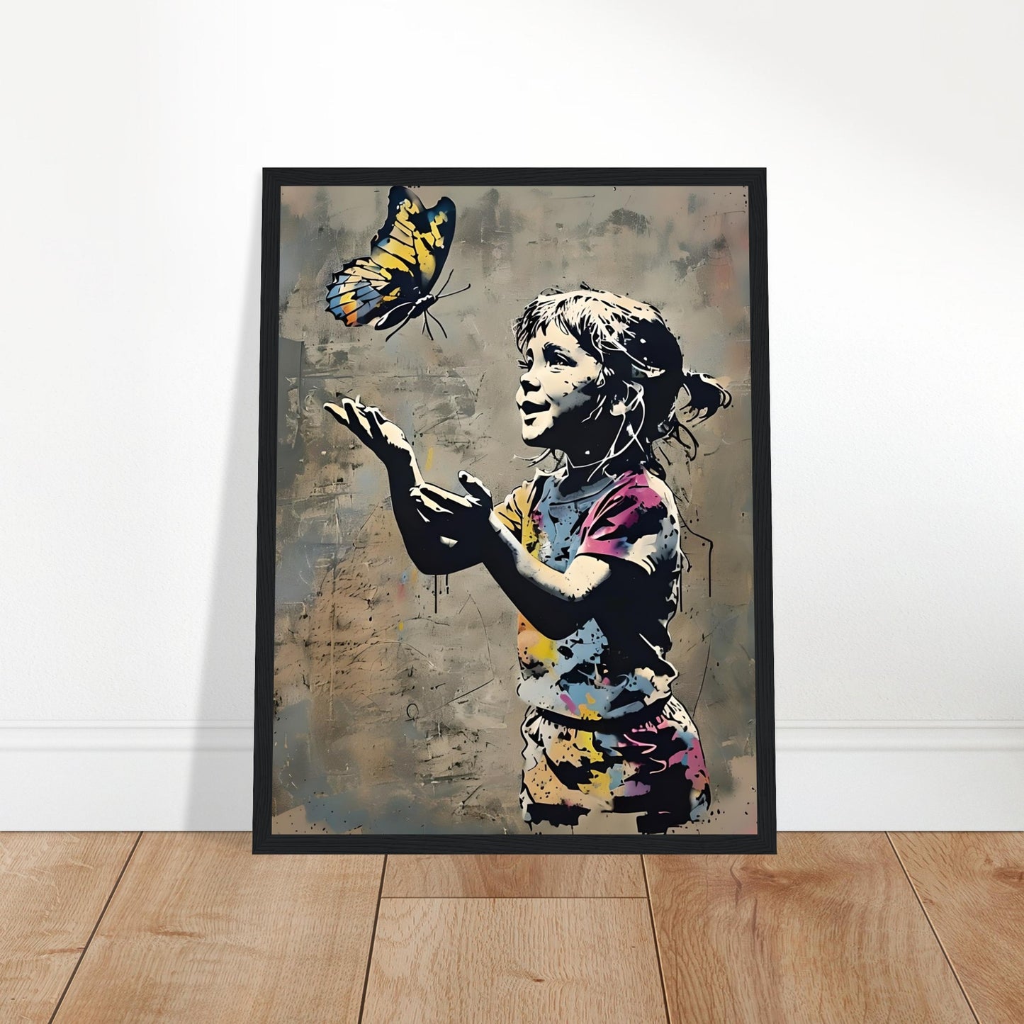 Transform your space with this stunning urban graffiti art print featuring a girl playing with a vibrant butterfly. This captivating piece masterfully blends the raw energy of street art with a touch of whimsy, making it an ideal addition to any modern home or artistic sanctuary. Whether you're looking to elevate your living room, bedroom, or studio, this framed poster effortlessly brings a burst of color and personality to your walls.