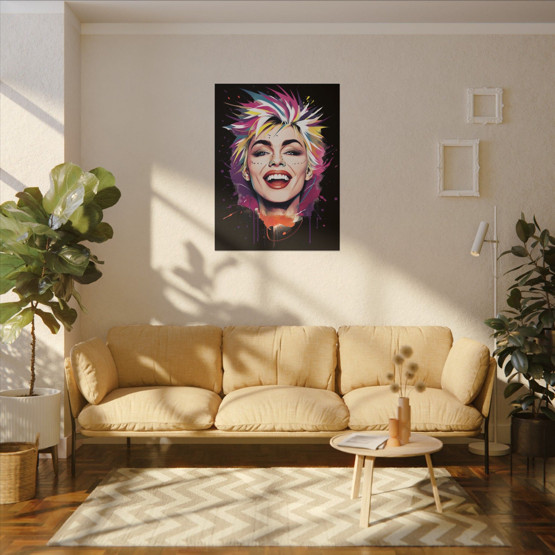 Vibrant 80s Vibe Art Print: Smiling Portrait with Colorful Splashes